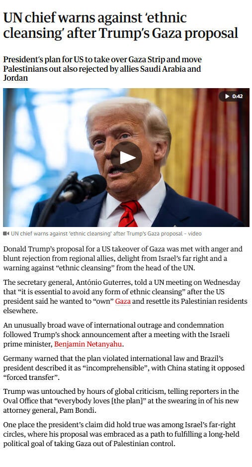 https://www.theguardian.com/world/2025/feb/05/un-chief-warns-against-ethnic-cleansing-after-donald-trump-gaza-proposal (UN chief warns against ‘ethnic cleansing’ after Trump’s Gaza proposal)